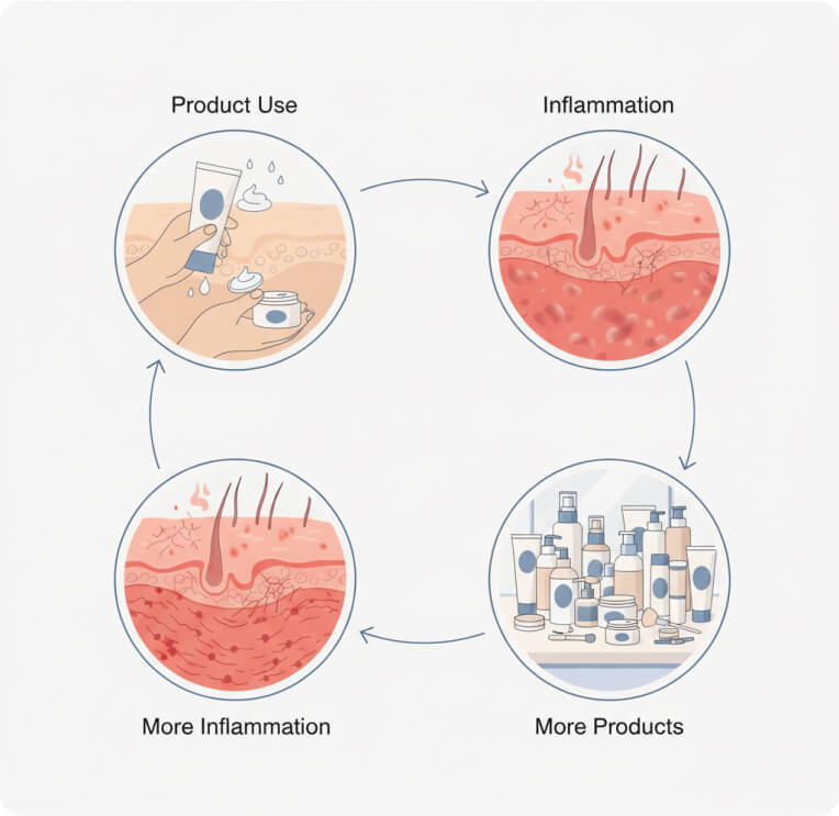 This creates a vicious cycle: your skin becomes inflamed, so you buy more products to "fix" it, which in turn creates more inflammation. Meanwhile, you're spending hundreds of dollars making the problem worse.