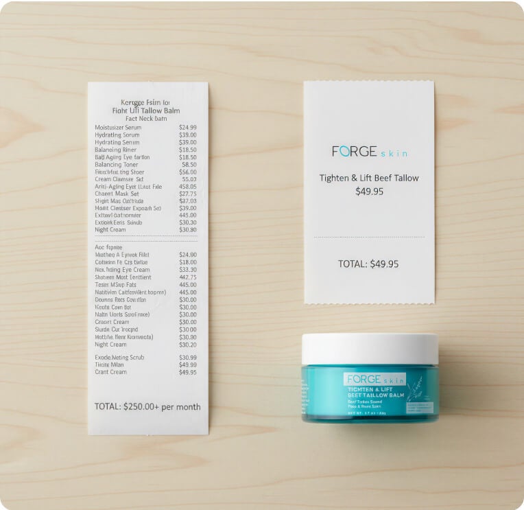 Forge Tighten & Lift Tallow Balm gives you back your time AND your money. This single balm deeply moisturizes without clogging pores, reduces fine lines, promotes firming in sagging areas, delivers essential nutrients, and protects against environmental damage.
